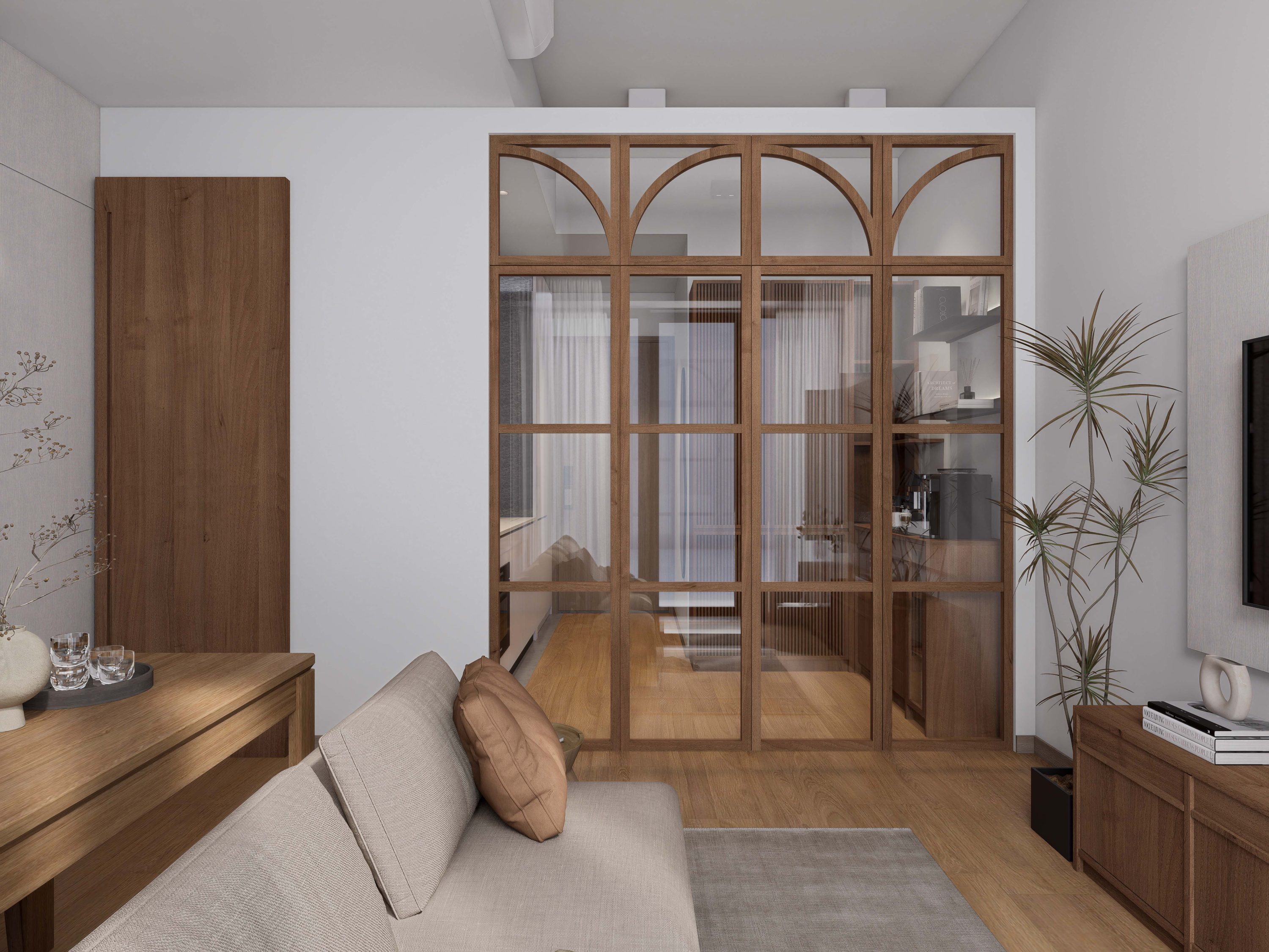 為兩位戶主與愛貓量身打造的空間,設計重點在於打破傳統格局的封閉感。設計上選用戶主鍾情的深胡桃木色為基調,營造濃厚且溫潤的復古懷舊底蘊。新樓的開放式廚房設計往往令貓主人帶來不便,設計師巧妙地以帶有連續拱影的木質玻璃隔斷替代實體牆,這扇美如畫框的屏風不僅是視覺焦點,更在不阻礙採光與通透感的前提下,優雅地阻隔貓咪進入開放式廚房。 空間規劃捨棄了繁雜裝飾,利用電視牆的流暢圓弧曲線與隱藏燈帶,柔化了邊角並賦予輕盈的現代感,讓小倆口的居家生活在開闊的視野中,完美融合了復古情懷與實用功能。家不只是風格的堆砌,更是比例與材質的精準對話。