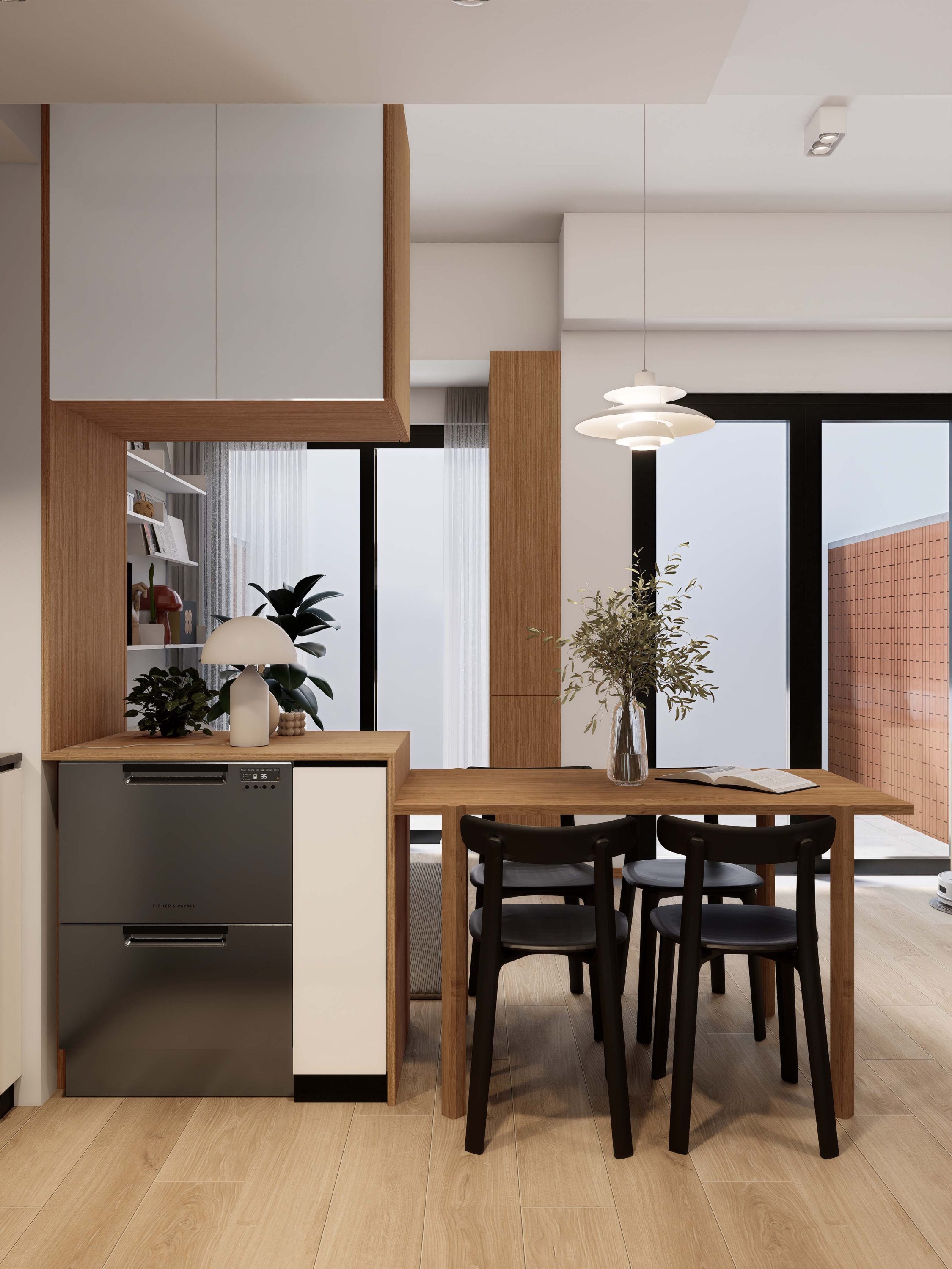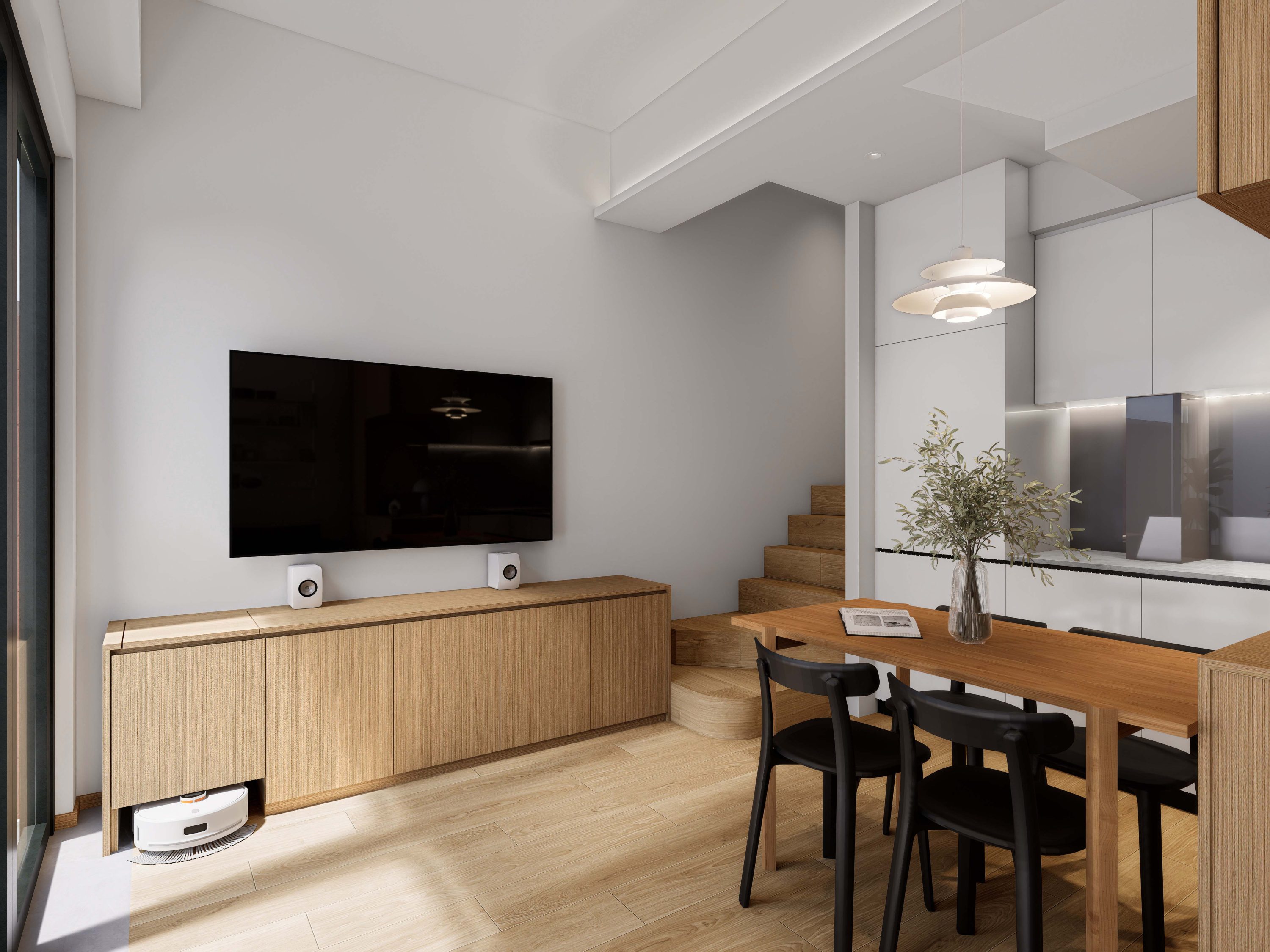 是次是位於新樓親海駅的小複式單位設計,樓下是客飯廳連開放式廚房,樓上是浴室及睡房。單位的優點是擁有落地大玻璃窗,空間感及採光度十足,戶主亦希望保留天然優勢,但同時原則局限了儲物量及用餐空間。在兩者之間取得平衡,設計師在開放式廚房延伸出吧枱及餐邊高櫃,透過櫃體與色塊的過渡完成區隔與串聯。動線鬆弛、感受自由,功能之間彼此銜接,卻不互相干擾。