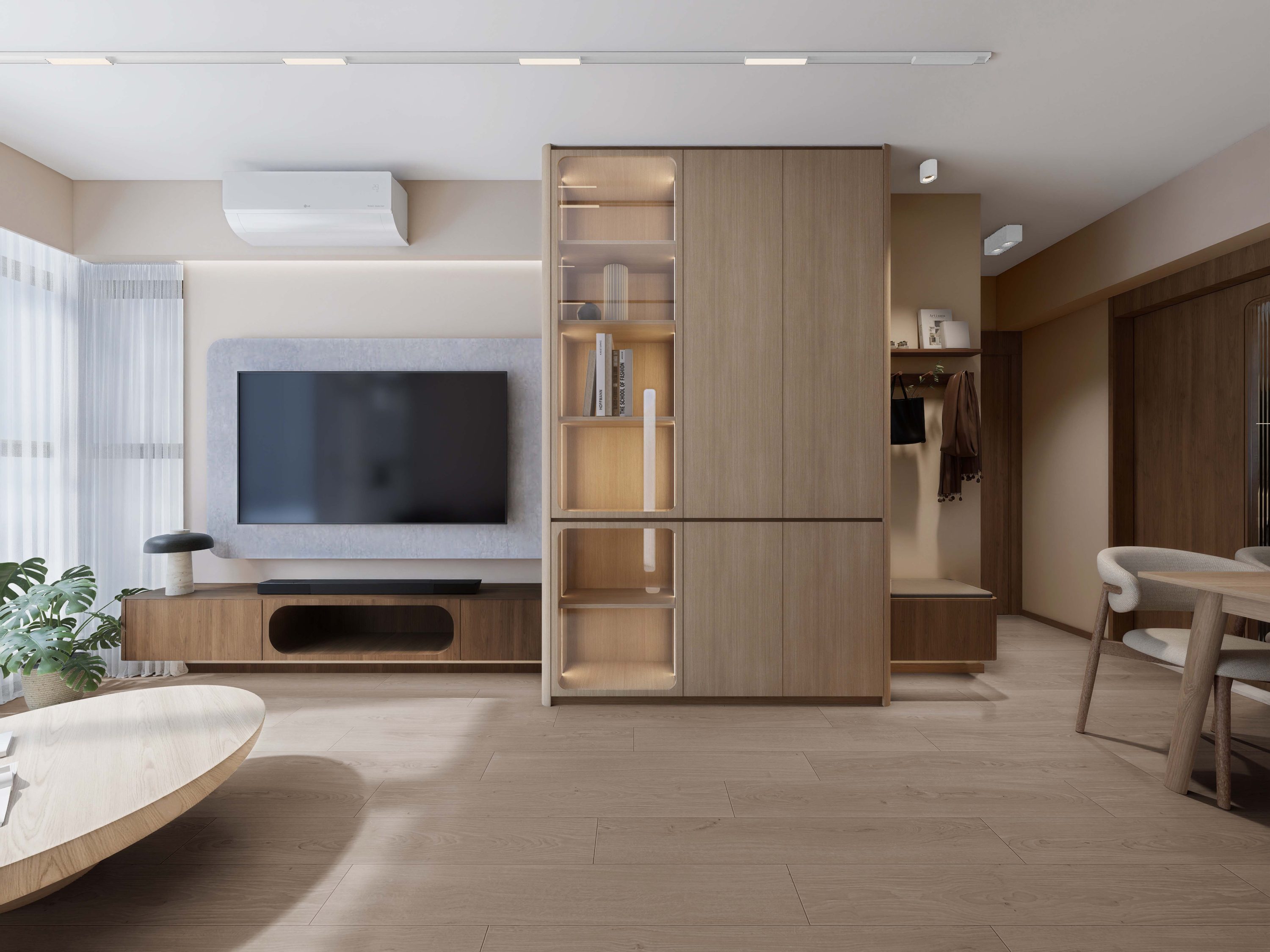 這個以溫潤木調鋪陳,結合淺米色的單位-是一對新婚夫婦開展新生活的溫馨新居 。戶主二人鍾情日式設計,透過極致的留白和天然木質,配合窗外開揚海景,讓家散發出平靜、靜心的氛圍。客廳的電視牆身以淺灰色特式牆、深淺木色交織而成,同時俱備各種功能性,例如換鞋坐位、掛衣區、儲物櫃及展示櫃等。戶主希望其中一個房間可打造成日式茶室,同樣以柔和的色調為主,設計師加設榻榻米地台設計可讓他們席地而坐,旁邊的木條子儲物櫃可擺放茶具及裝飾,再配上矮桌、座墊等元素,利用自然光線,營造素淨的茶室和敞亮的空間。書房利用窗台作書枱及開放式衣櫃,保留空間的靈活性。